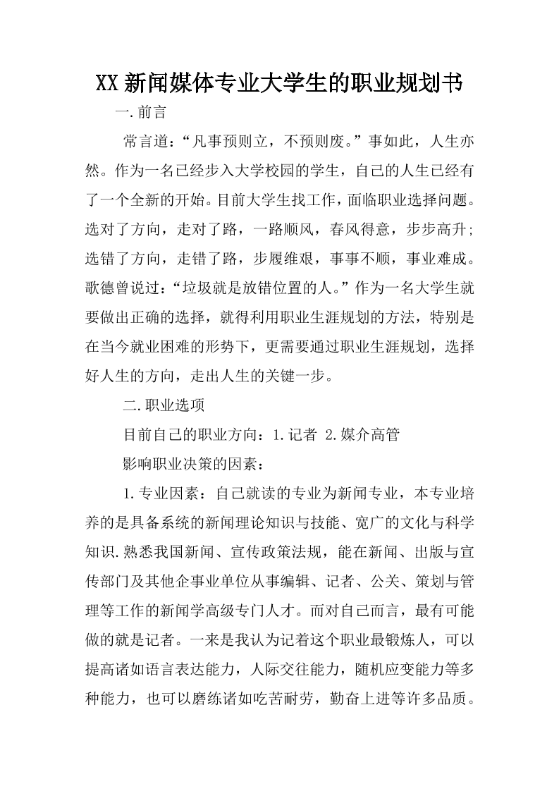 XX新闻媒体专业大学生的职业规划书