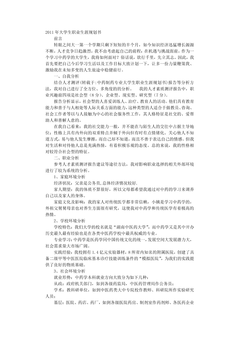 中药学职业规划书模板范文