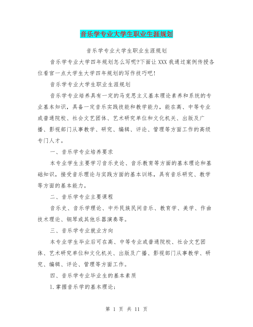 音乐学专业大学生职业生涯规划(最新篇)