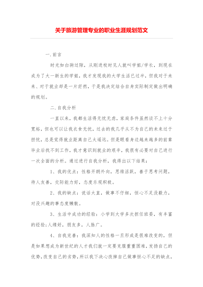 关于旅游管理专业的职业生涯规划范文