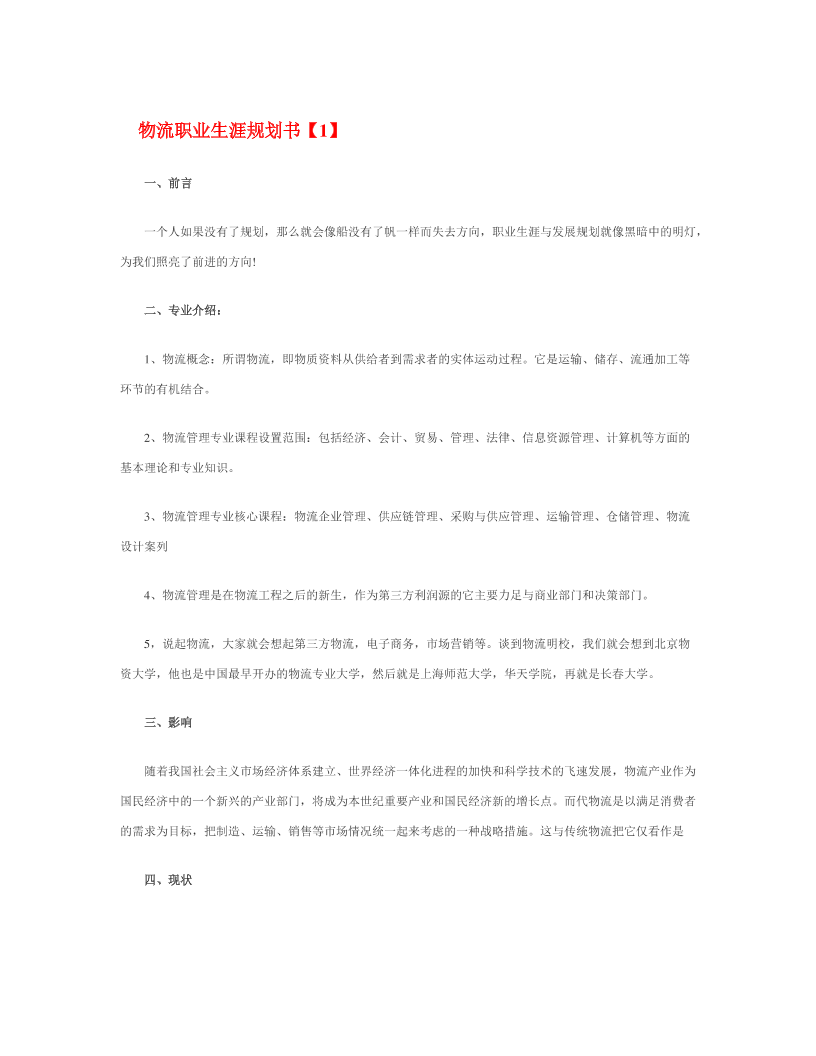 物 流 职 业 生 涯 规 划 书
