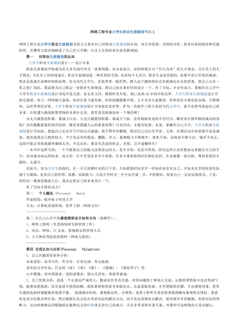 网络工程专业大学生职业生涯规划书范文