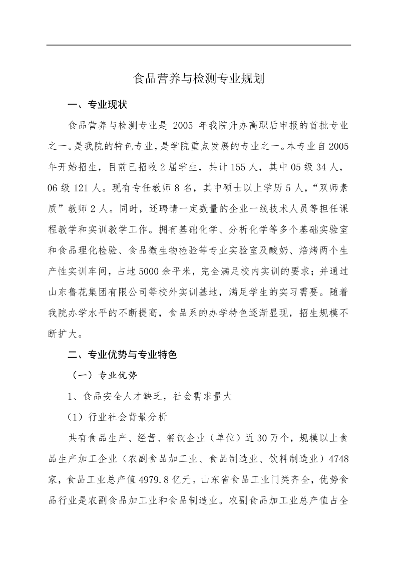 食品职业学院食品营养与检测专业规划