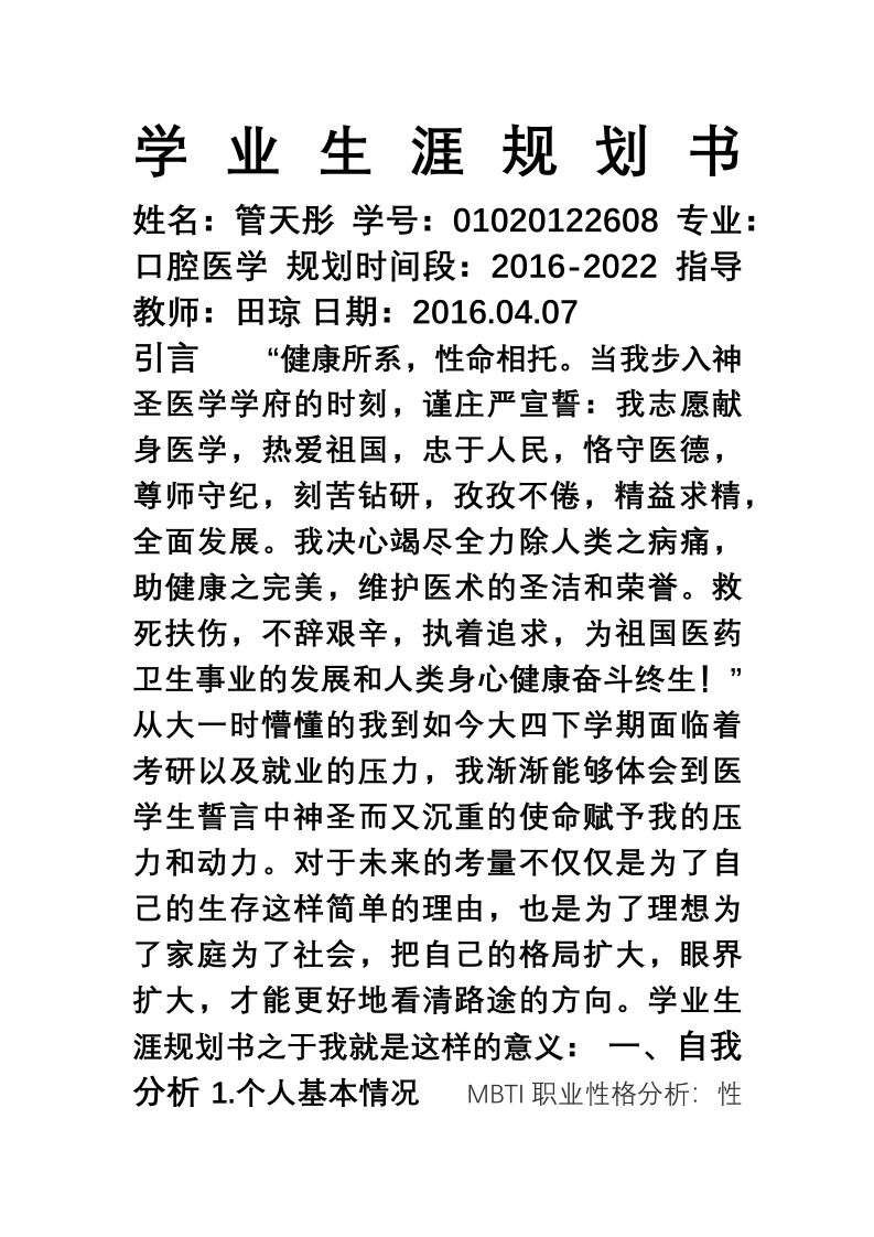 大学生学业规划书口腔医学版