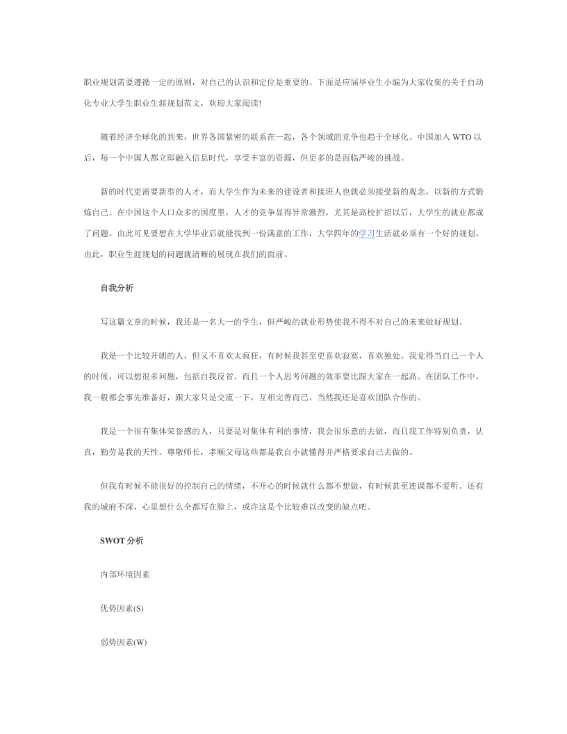 自 动 化 专 业 大 学 生 职 业 生 涯 规 划 范 文